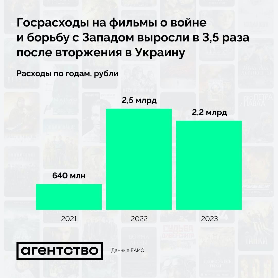 После полномасштабного вторжения в Украину Фонд кино и Министерство культуры выделили 4,1 млрд рублей (2,2 млрд – в 2022 году и 2,5 млрд – в 2023-м) на фильмы о войнах, в которых участвовала Россия или СССР, и о конфликте с Западом. В последнем довоенном году расходы на такие картины составили лишь 640 млн рублей. То есть среднегодовые расходы двух первых лет войны оказались 3,5 раза больше годовых трат последнего предвоенного года.