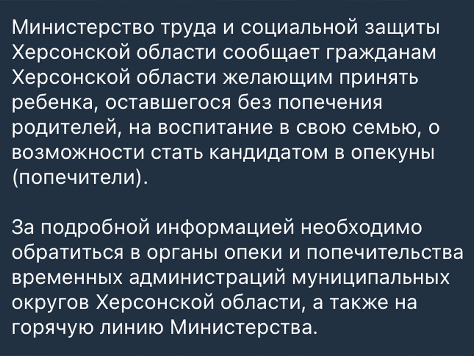 Телеграм-канал назначенного РФ министерства труда и социальной политики оккупированной части Херсонской области