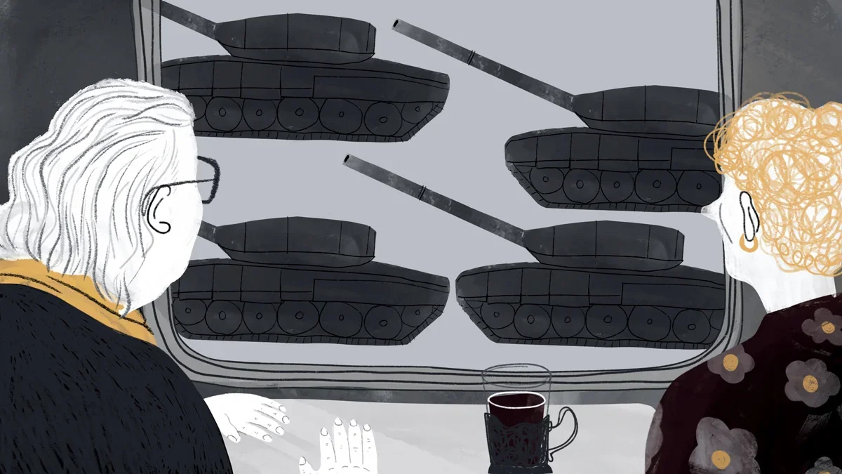 Raisa looks out the window, and her face becomes even more wrinkled as she tries to hold back her tears. There is a freight train outside with tanks, cannons, and other lethal equipment on its open platforms.