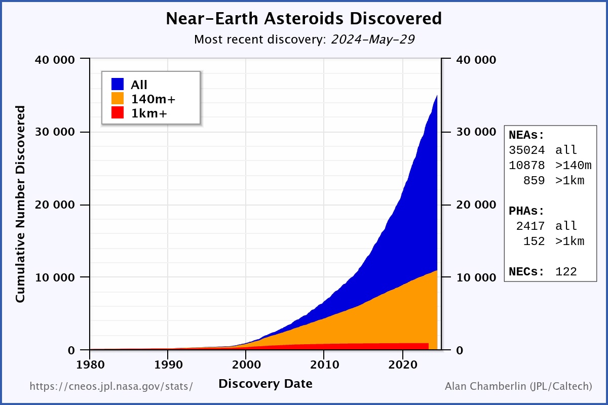«…Май 2024 завершается преодолением нового рубежа — каталогизировано свыше 35 тысяч околоземных астероидов. Напомню, что на начало XX века мы знали лишь один астероид, сближающийся с Землей. В 1980 году их было 44. Отметку в 30 тысяч мы прошли лишь осенью 2022 года.
