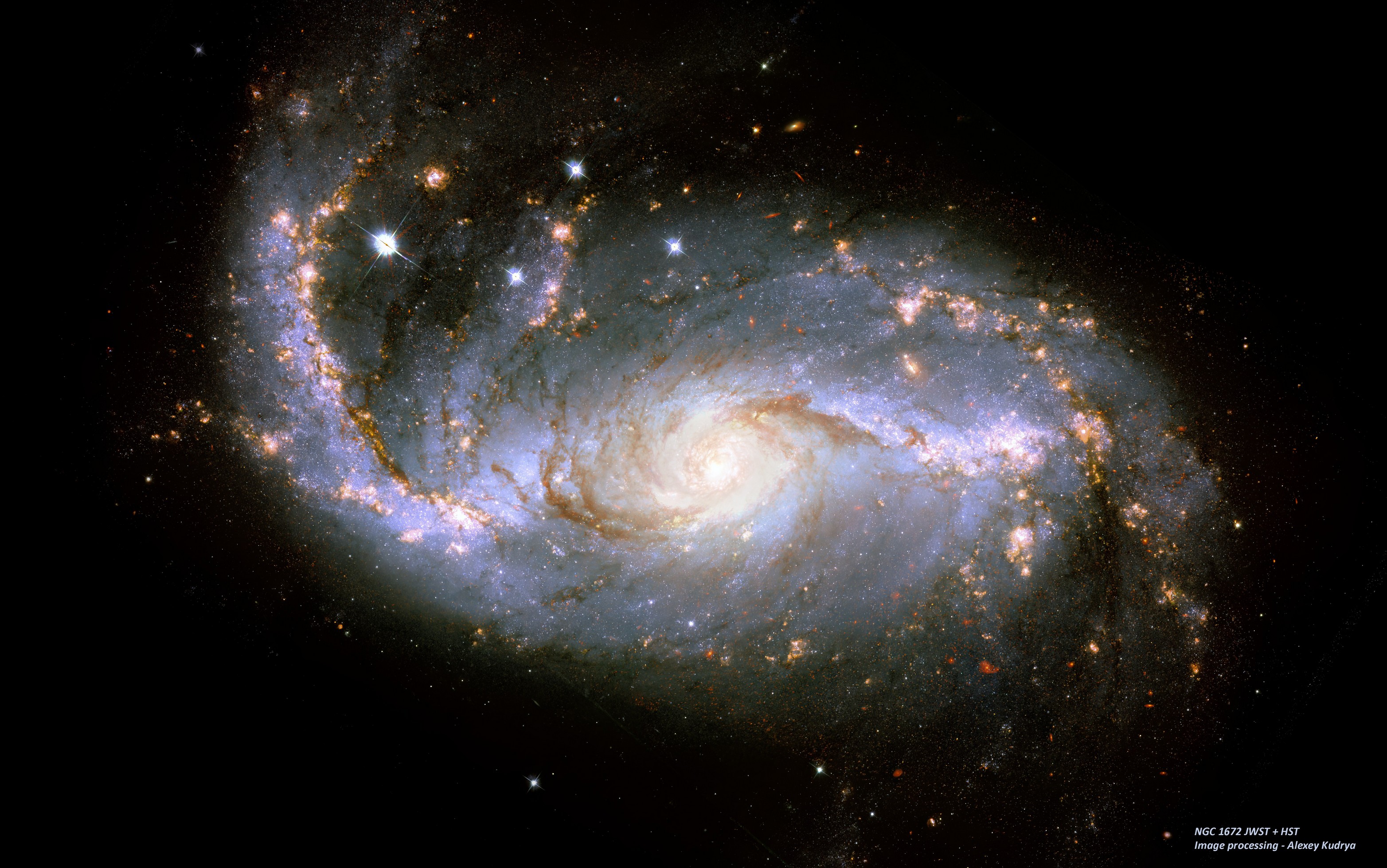 Яркая, хорошо заметная перемычка NGC 1672 — область активного звездообразования. На снимке хорошо видны протозвездные облака и большие области межзвездной пыли. В центре галактики предположительно расположена сверхмассивная черная дыра, поэтому NGC 1672 относят к галактикам c активным ядром (AGN).