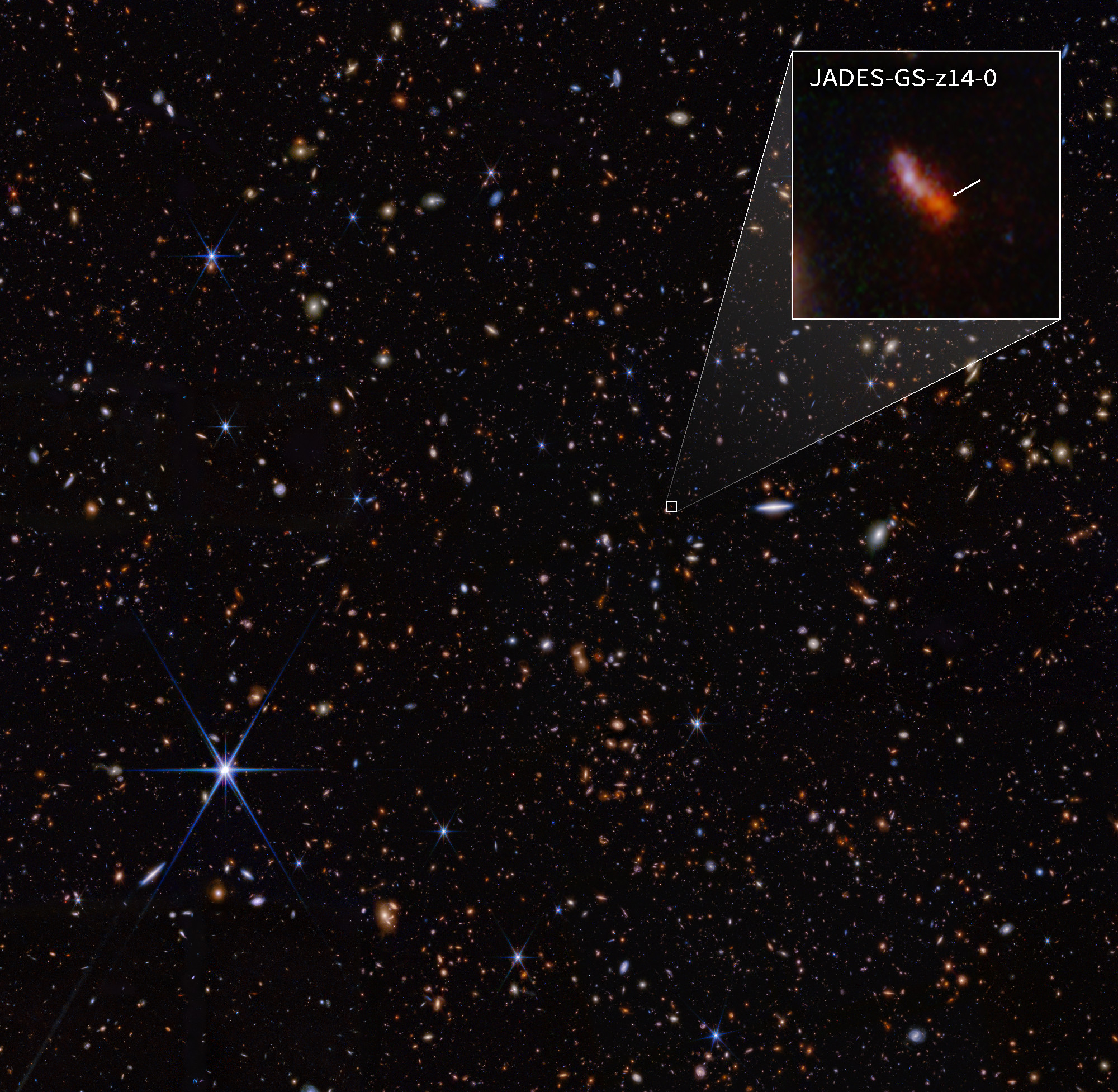 В январе 2024 года ученые получили результат работы спектрографа ближнего инфракрасного диапазона NIRSpec. Галактика, впоследствии названная JADES-GS-z14-0, наблюдалась в течение почти десяти часов. После того, как были обработаны спектральные данные, исследователи определили, что она находится дальше всех наблюдаемых ранее объектов. Полученное значение красного смещения составило z = 14,32, что перекрывает предыдущий рекорд z = 13,2 (320 млн лет после Большого взрыва) у JADES-GS-z13-0.