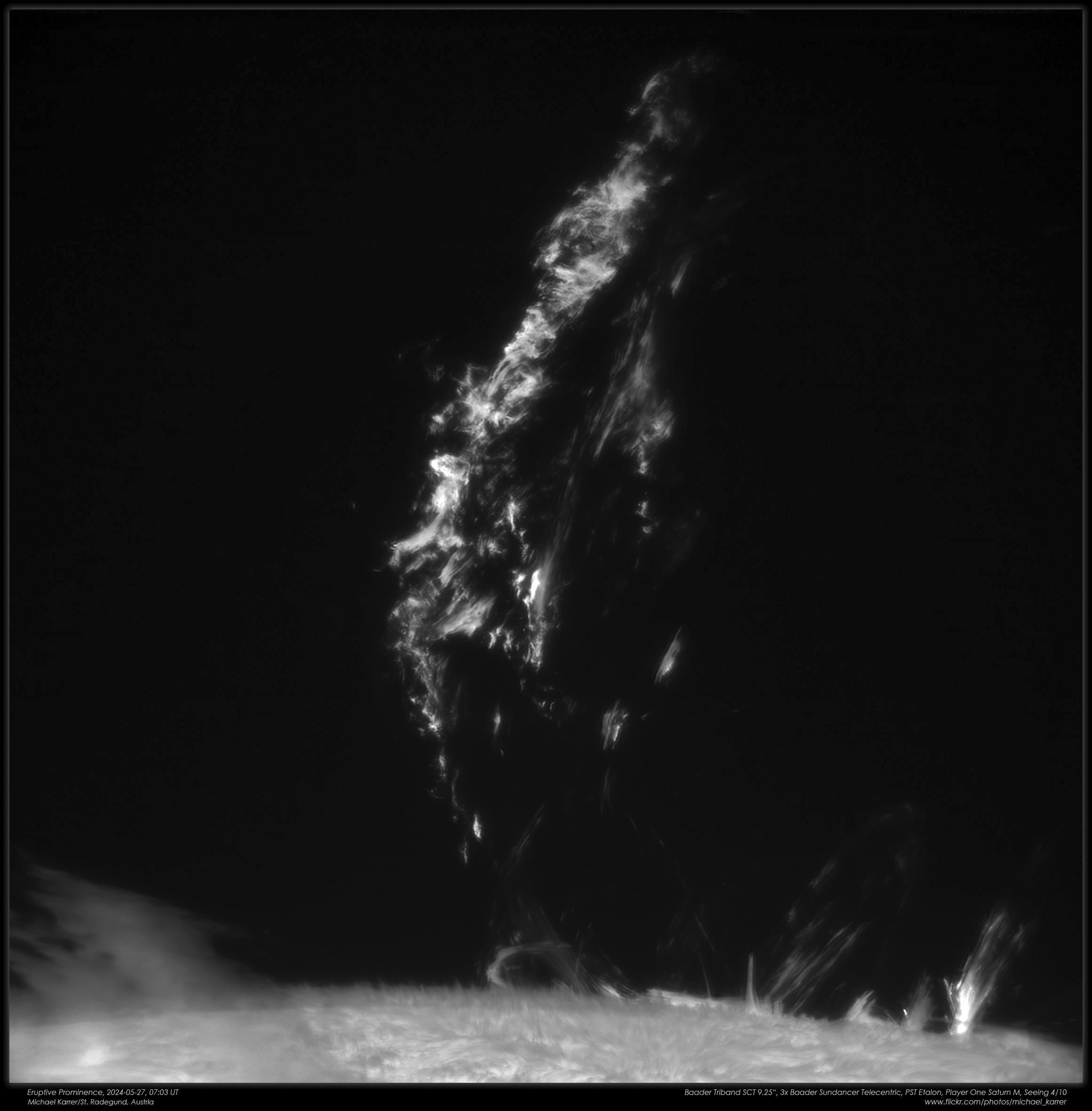 И вот только что произошла новая вспышка мощности Х2.8. Правда, не в упомянутой группе пятен, а в другой — которая еще не видна. Вспышка произошла в той же группе пятен 13664, которая выдала в начале мая 13 (!!!) вспышек класса Х и серию выбросов, породивших мощнейшую геомагнитную бурю G5 10–12 мая. Пока что эта группа пятен прячется за краем Солнца, но гигантские вспышечные магнитные петли вспучились на юго-восточном лимбе светила.