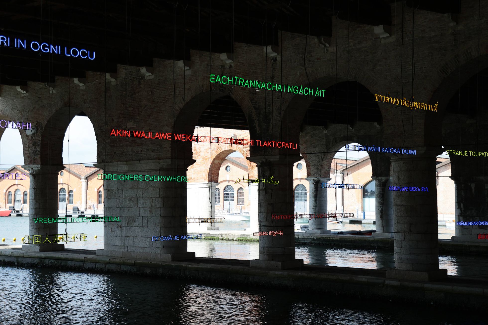 Над водой Арсенала — знаменитой верфи, где расположен основной проект биеннале — горят разноязыкие неоновые вывески. Все они сообщают одно и то же: «foreigners everywhere». Мы будто наблюдаем облака мыслей, которые местные жители разделяют с путешественниками (мысли же бестелесны — почему бы им не носиться над водой?). Действительно, на каком бы языке вы ни думали, в Венеции вас всегда окружают иностранцы. Да и не только в Венеции.