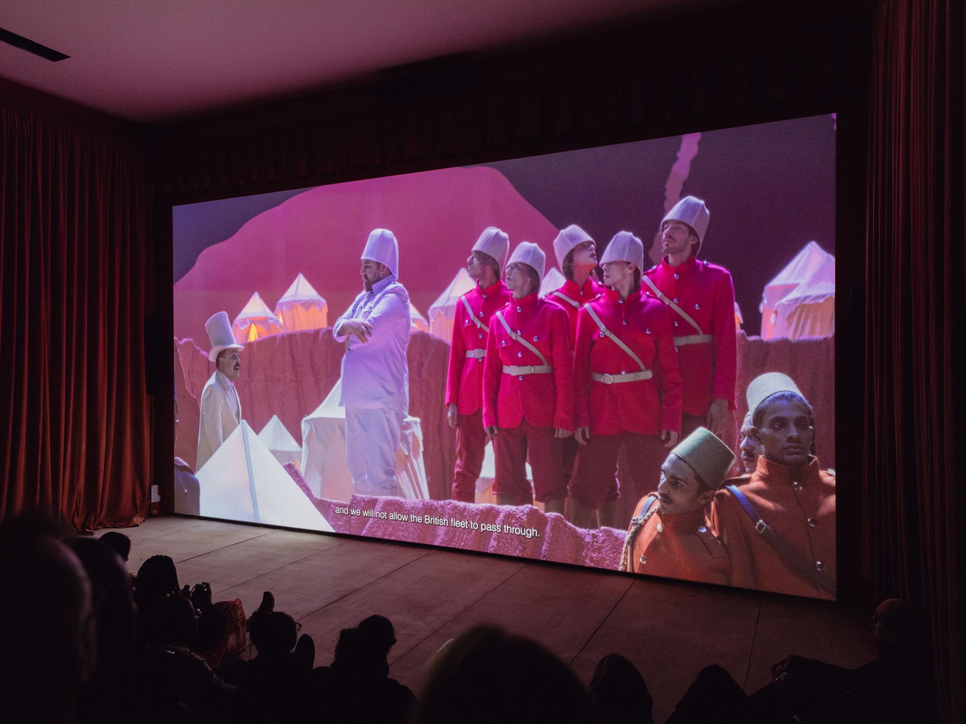 Шедевр биеннале — «Драма 1882», короткометражная (меньше часа) киноверсия оперы, которую написал и срежиссировал художник Ваэль Шауки, представляющий на биеннале Египет. «Драма 1882» рассказывает о британской оккупации Египта: британцы захватили страну, чтобы взять под контроль Суэцкий канал. Блестящий композитор, хореограф и сценограф в одном лице, Шауки прибегает к нарочито архаичному театральному языку, чтобы показать трагические события прошлого: колонизаторы-европейцы все как один носят нелепые высокие шляпы; дома и дворцы — явно из картона или чего-то подобного. Эта несколько наивная, схематичная манера помогает Шауки обращаться к интеллекту зрителя, а не к его чувствам: мы не сопереживаем отдельным героям, а осмысляем масштабные процессы, которые затрагивают общество в целом — в точности по заветам театрального реформатора Бертольта Брехта.