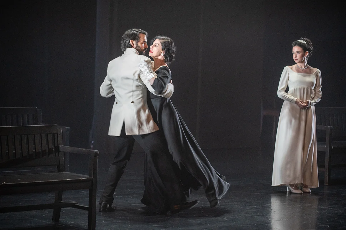 Реквизита минимум. Костюмы самые нейтральные. Если бы не белоснежный офицерский мундир Вронского (Ави Азулай) в первом акте, вполне можно предположить, что действие происходит, скажем, в 1910-е годы ХХ века. Особой разницы не чувствуется.