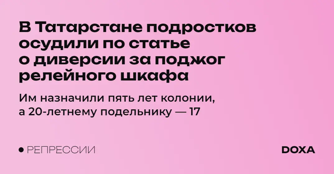 Верховный суд Татарстана признал 17-летних Реваля Курманаева и Егора Куницына, а также 20-летнего Булата Ибрагимова виновными по статьям о диверсии за поджог релейного шкафа. Подростков приговорили к пяти годам воспитательной колонии, Ибрагимову назначили 17 лет лишения свободы, три из которых он должен провести в тюрьме.
