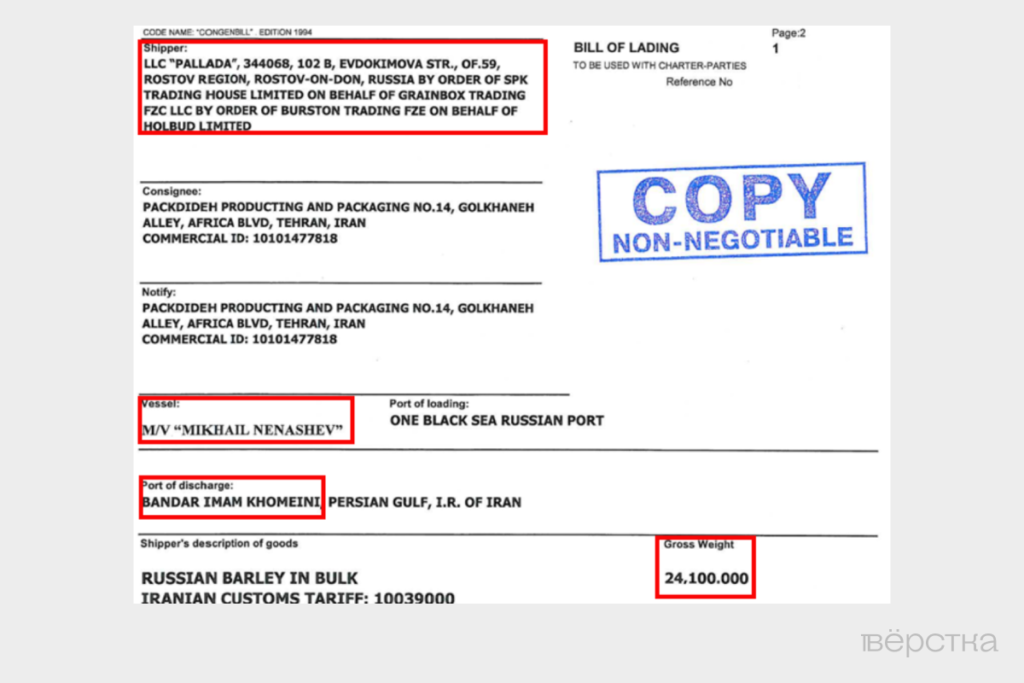 Судном, которое было зафрахтовано для перевозки херсонского ячменя, оказался перевозчик краденой украинской сельхозпродукции Mikhail Nenashev. Документы, которые есть в распоряжении журналистов, подтверждают поставку, упомянутую в расследовании Lloyd’s List Intelligence, Scripps News и Bellingcat.