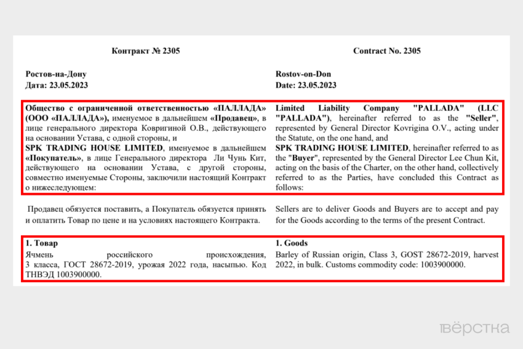 В июне 2023 года комиссия за один день успела рассмотреть три заявки на вывоз продукции из Херсонской области от российского ООО «Паллада». Два протокола о предоставлении квот на вывоз в сумме на 11 тысяч тонн ячменя касаются исполнения контракта с Гонконгской компанией SPK Trading House Ltd.