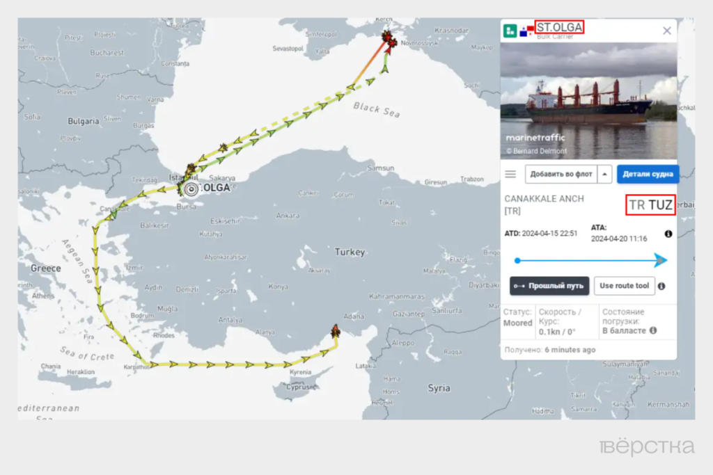 Благодаря деталям из «Заключения о карантинном фитосанитарном состоянии подкарантинной продукции» журналистам удалось отследить маршрут, по которому пшеница с оккупированной украинской территории попадала в Турцию. «Агро-Фрегат» зафрахтовал судно Alfa M, которое, согласно данным MarineTraffic, находилось в Севастопольской бухте с 30 июля. 7 августа Alfa M вышло с 9553,7 тонны продукции на борту и направилось в порт «Кавказ», находящийся в Керченском проливе. Согласно документам, которые журналисты получили от аналитического центра SeaKrime, 9 августа в порт «Кавказ» зашло судно ST. OLGA, на которое перегрузили товар с Alfa M. ST. OLGA привезло пшеницу в турецкий порт Мерсин.