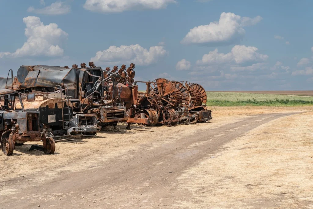 Разрушенная сельскохозяйственная техника села Большая Александровка Херсонской области, в котором производили зерно. Фото: Profimedia.