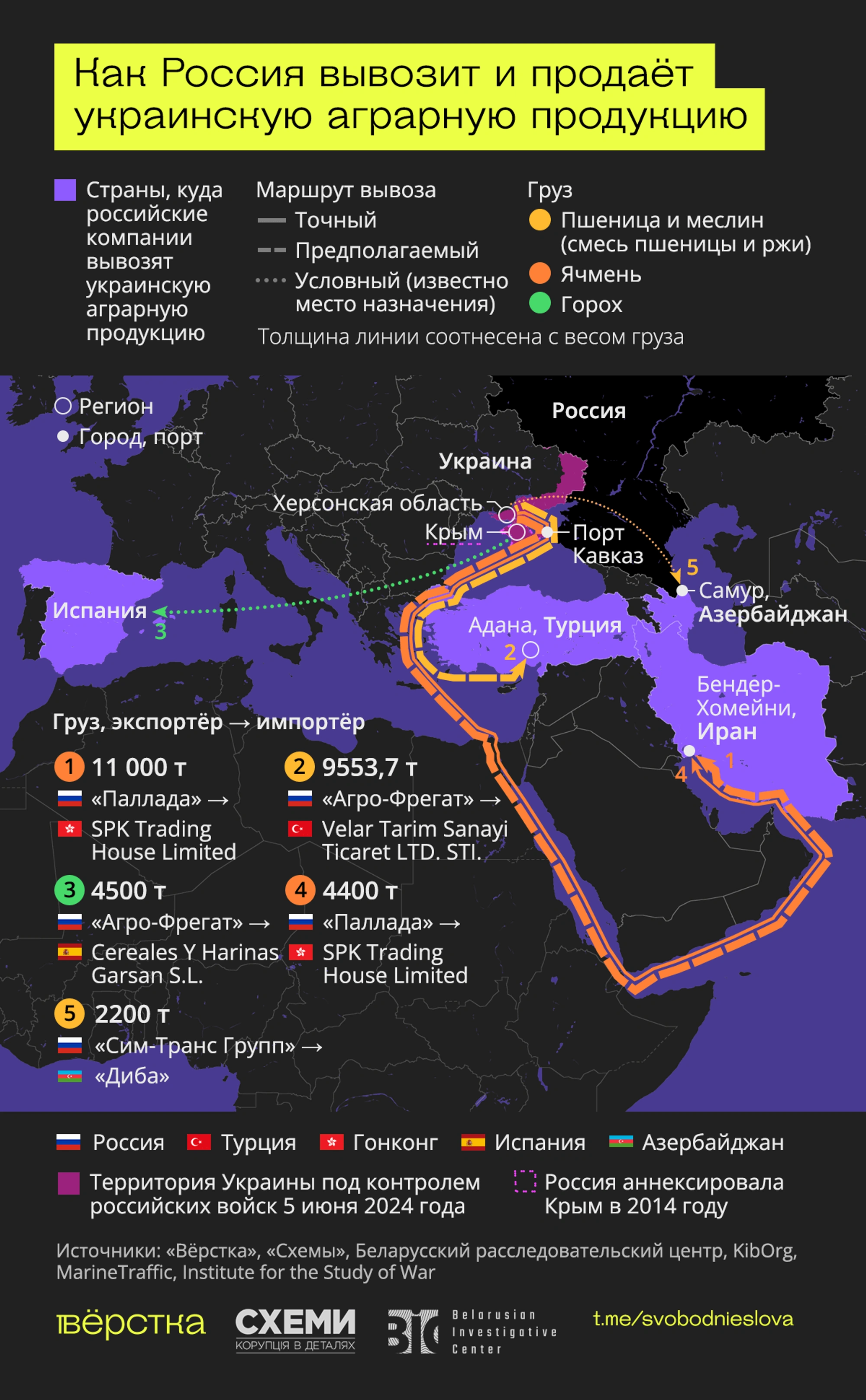 30 тысяч тонн пшеницы, меслина и кукурузы, экспорт которой удалось подтвердить журналистам, благодаря утечке документов и проверке по базам импорта-экспорта, — это лишь малая часть вывезенной в 2023 году с оккупированной части Украины агропродукции, то, что удалось доказать документально.