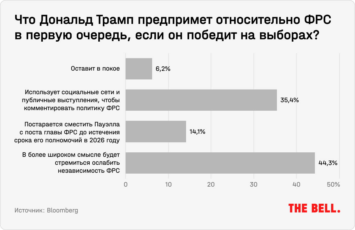Другая, немаловажная, но более спорная причина возможного разгона инфляции — потеря независимости ФРС в случае победы Трампа. Около 40% опрошенных Bloomberg участников рынка и читателей считают, что Трамп разными способами, в том числе через соцсети и публичные выступления, попробует ослабить независимость регулятора.
