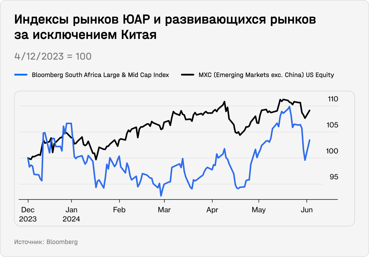 Несмотря на все это, довольно быстро после выборов рынки начали восстанавливаться. Bloomberg South Africa Large & Mid Cap, который включает акции компаний средней и крупной капитализации, растет вместе с другими индексами развивающихся стран, за исключением Китая, который уже давно двигается отдельно. В начале недели финансовые и политические аналитики начали склоняться к тому, что АНК, вероятно, заключит коалиционное соглашение с более центристским и пробизнесовым Демократическим альянсом, который получил 21,8% голосов на выборах. У политических партий есть две недели, чтобы договориться до того, как новый парламент соберется и выберет президента. Вероятно, этот сценарий будет наилучшим для рынков.
