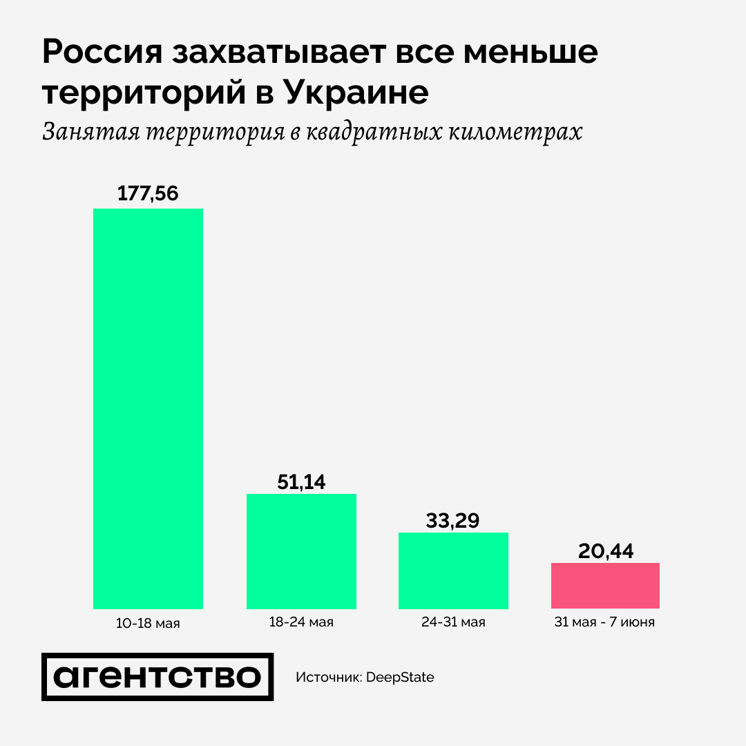 Детали. Если в первую неделю наступления в Харьковской области российские войска захватили 177 кв км территории на всей линии фронта, то за последнюю неделю — только 20 кв км. Это меньше, чем а неделю до открытия фронта в Харьковской области (4-10 мая): тогда Россия заняла 31 кв м территории.