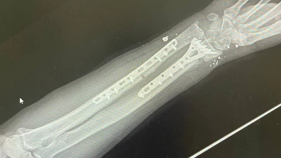 Рентген руки Александра Прозорова с пластинами для сращивания сломанных костей
