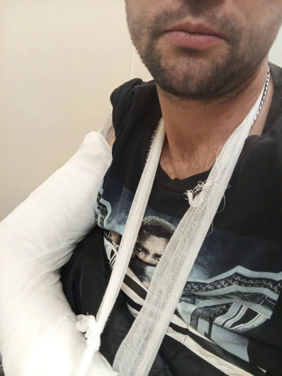 «Стук чем-то тяжелым в дверь, я подошел, открыл и сразу без слов получил бруском большим в голову. Я упал, и сосед начал меня забивать по всему телу палкой, вся голова в шишках. Я закрывал голову руками. И, естественно, [он] сломал мне правую руку вместе с пластинами. Потом я потерял сознание. Когда пришел в себя, вызвал сотрудников полиции и скорую помощь, так как сам не мог даже встать. Меня доставили в тысячекоечную больницу, сделали рентген. Локтевая кость сломана вместе с титановой пластиной… Сейчас у меня впереди серьезная операция, так как нужна пересадка костей с бедра или заказывать искусственную кость».