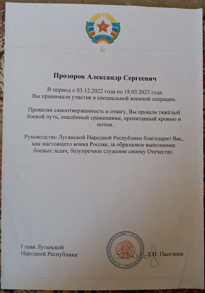 О том, что Прозоров «отважный и умелый боец», написано в справке от Межрегиональной общественной организации «Лига защиты интересов ветеранов локальных войн и военных конфликтов». Имеется благодарность «за образцовое выполнение боевых задач, безупречное служение своему Отечеству» от «главы ЛНР» Пасечника.