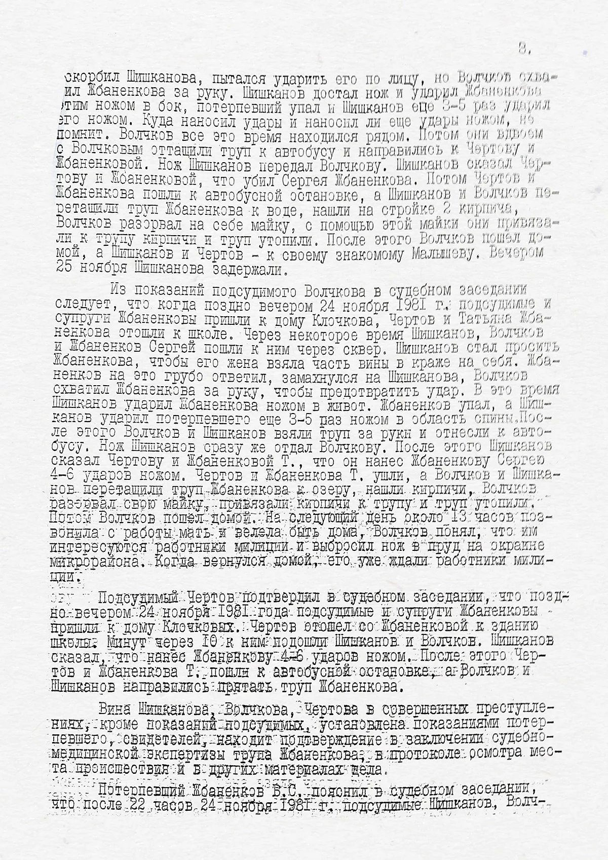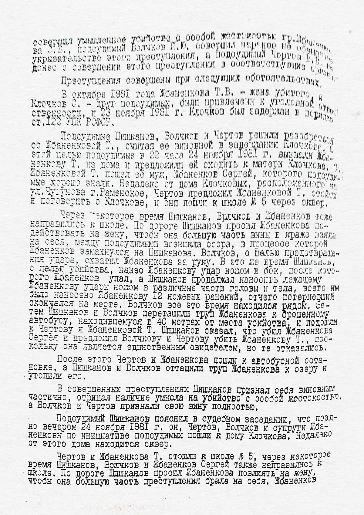 Из документа следует, что 24 ноября 1981 года, когда было совершено преступление и когда Олегу Шишканову было 17 лет и 4 месяца, он был пьян. И в состоянии алкогольного опьянения нанес 12 ножевых ранений Сергею Жбаненкову. Продолжал наносить удары ножом, добивал жертву, когда Жбаненков уже лежал, не сопротивляясь.