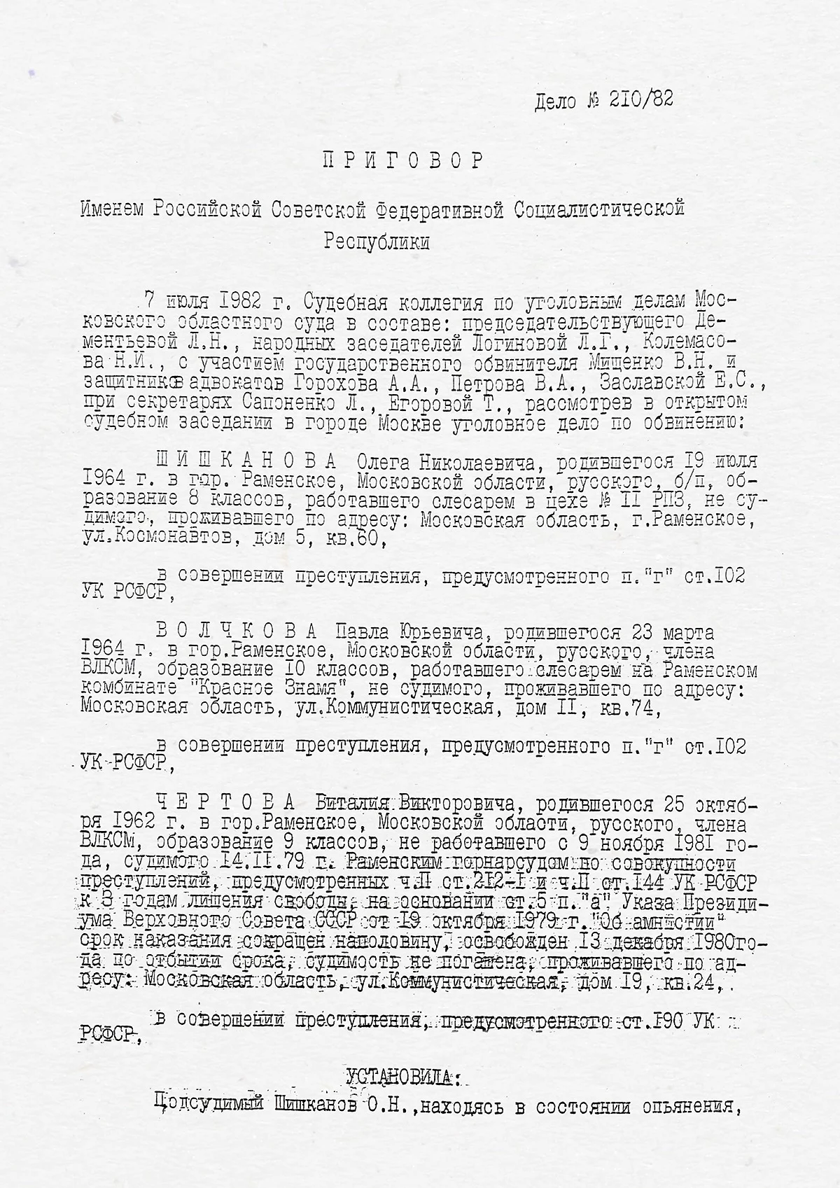 Но приговор, вынесенный 7 июля 1982 года Мособлсудом и копия которого оказалась в распоряжении «Новой», опровергает эту легенду.
