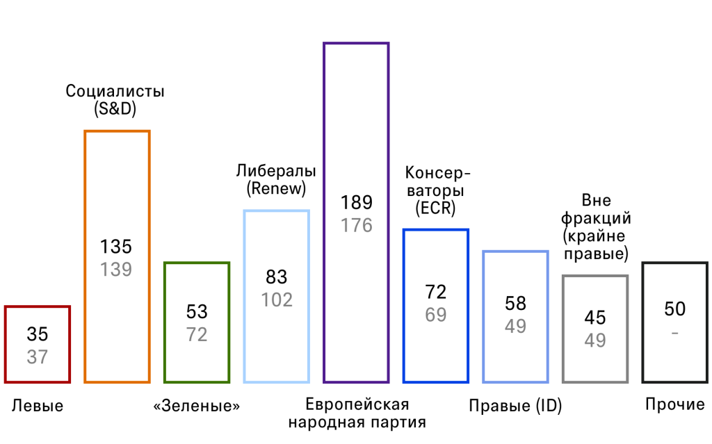 Результаты выборов в Европарламент принесли несколько неожиданностей. Ожидание натиска крайне правых, по всей видимости, мобилизовало избирателей-центристов. В итоге фракции центристских партий, которые в прежнем составе входили в неформальную коалицию действующей главы Еврокомиссии Урсулы фон дер Ляйен, получают 407 мест из 720 — на 46 больше, чем требуется для избрания главы Еврокомиссии. 407 — это на 10 мест меньше, чем у коалиции было в прошлом составе. Фракция христианских демократов из Европейской народной партии фон дер Ляйен увеличится со 176 до 189 мест. У социалистов (S&D) будет 135 мест (было 139), у либералов («Renew») — 83 (было 102). Наряду с либералами, главными неудачниками выборов стали «зеленые» — их фракция сократится с 72 до 50 депутатов.