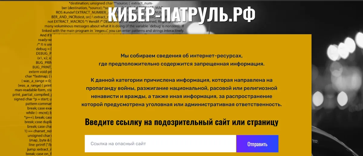 Вот он развивает плодотворную идею дальше, презентуя при поддержке властей и силовиков проект «Кибер-патруль.рф»:«Любой пользователь Интернета может стать его участником и буквально в три клика сообщить полиции о нарушении закона в Сети. Для этого нужно зайти на сайт кибер-патруль.рф и внести туда адрес сайта с запрещенной информацией». Как пишут сегодня эти патрульные, идея «активно функционирует в Тюменской, Курской областях, Забайкалье, Волгограде, Югорске и в Коми, получен положительный эффект предупреждения преступлений при помощи инициативных граждан».