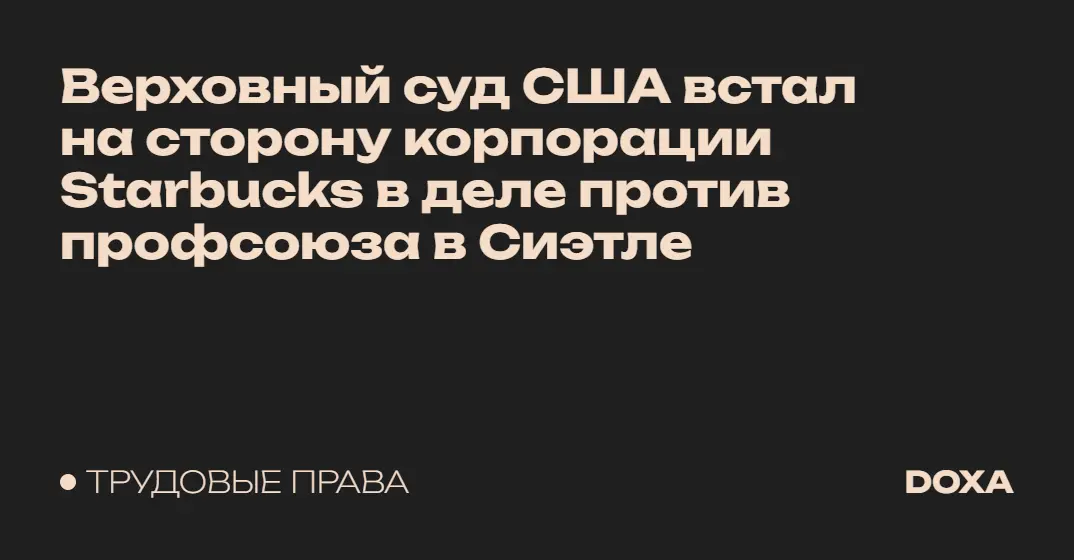 Верховный суд США встал на сторону корпорации Starbucks в деле оспаривания судебного приказа о восстановлении на работе семи сотрудни:ц кофейни из Мемфиса, уволенных за попытку объединиться в профсоюз. Ранее апелляционный суд девятого округа США отклонил претензии Starbucks к профсоюзу работни:ц кофейни в Сиэтле. Судьи отклонили это решение низшей инстанции суда.