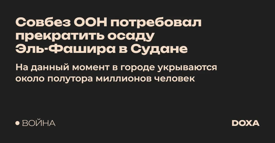 Совет безопасности ООН принял резолюцию, которая призывает Силы быстрого реагирования, воющие с армией Судана, прекратить осаду города Эль-Фашир — столицы штата Северный Дарфур. Резолюцию поддержали 14 стран-членок Совбеза, Россия воздержалась от голосования. Резолюция также требует от обеих воющих сторон обеспечить доставку гуманитарной помощи в Эль-Фашир.