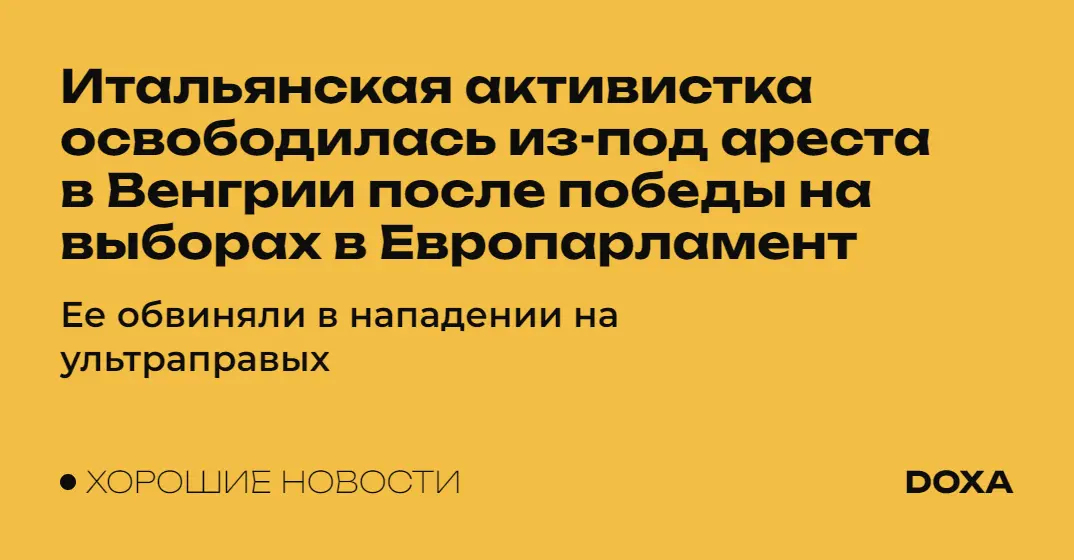 Итальянская активистка и антифашистка Илария Салис освободилась из-под домашнего ареста в Будапеште после того, как дистанционно избралась в Европарламент от «Альянса зеленых и левых». Ее партия набрала 6,8% на недавних выборах. Салис вернется в Италию 17 июня в свой 40-й день рождения.