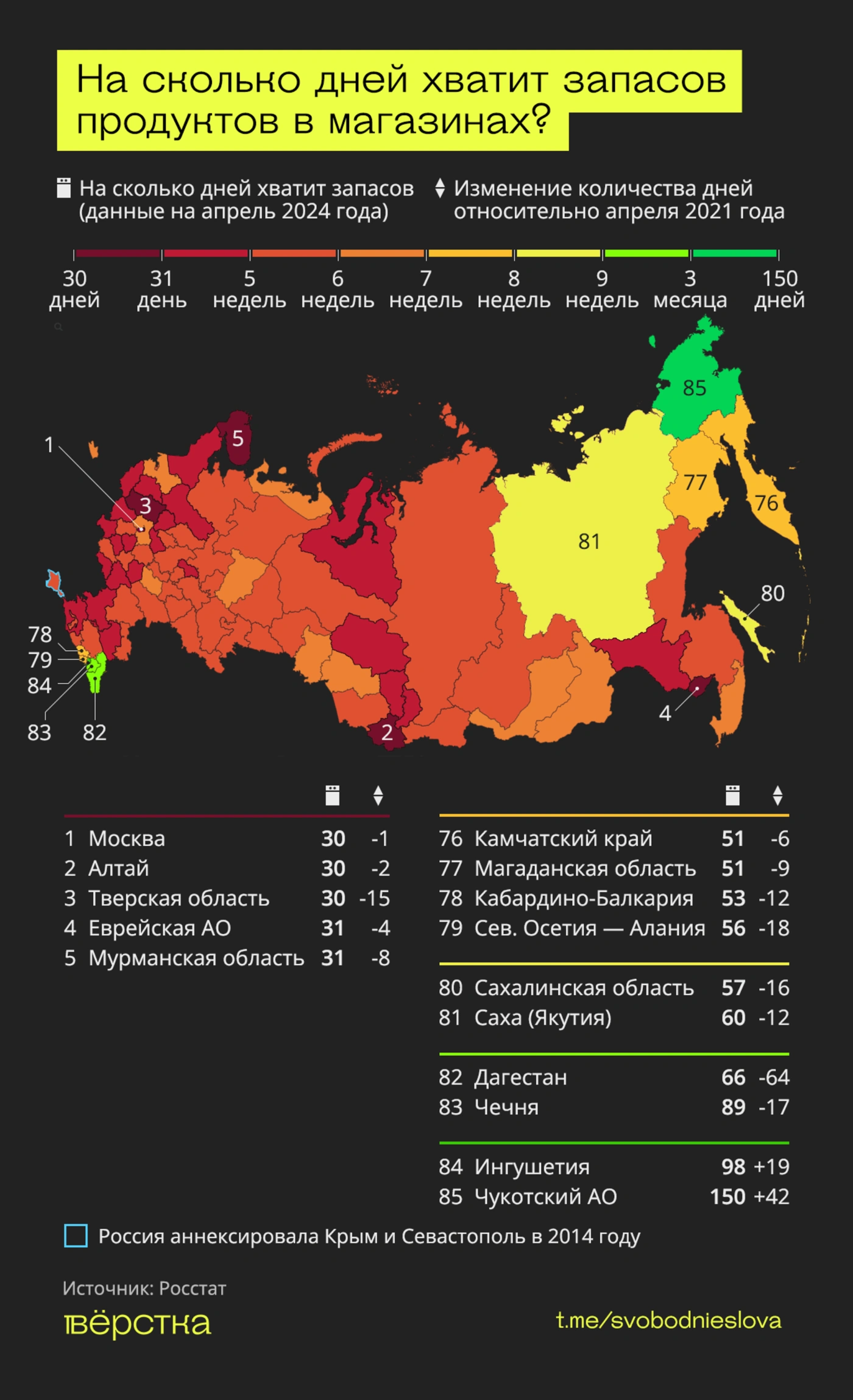 В региональных магазинах запасов продуктов хватает на разное время. Например, в апреле у рязанских продавцов товаров хватало на 36 дней, у якутских — на 60, у калининградских — на 47. С довоенного 2021 года сильнее всего показатель сократился в Дагестане: в середине весны запас еды на продажу на складах местных магазинов стал на 64 дня меньше, чем был тремя годами ранее. Ощутимое снижение по этому параметру показали Осетия (18) и Чечня (17). А вот соседняя Ингушетия запасы продуктов в магазинах увеличила на 19 дней, Башкортостан — на 3, Чукотка — на 42.