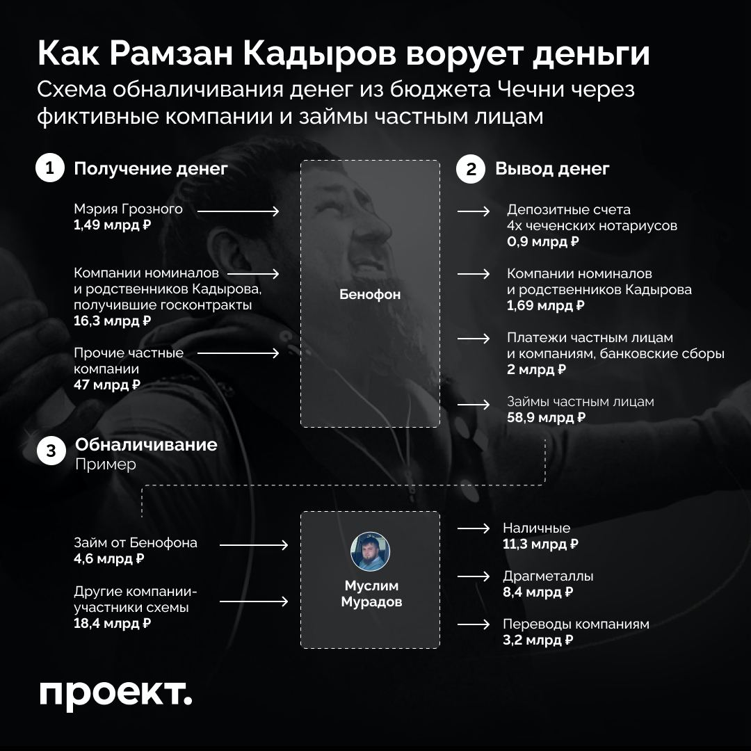 Детали. Вывод денег осуществляли через три чеченские фирмы – «Бенофон», «Орбита» и «Изумруд». У них один номинальный владелец, практически нет сотрудников и подрядчиков. При этом по состоянию на конец 2023 года они владели активами на 150 млрд рублей – эта сумма равна всему бюджету Чечни.