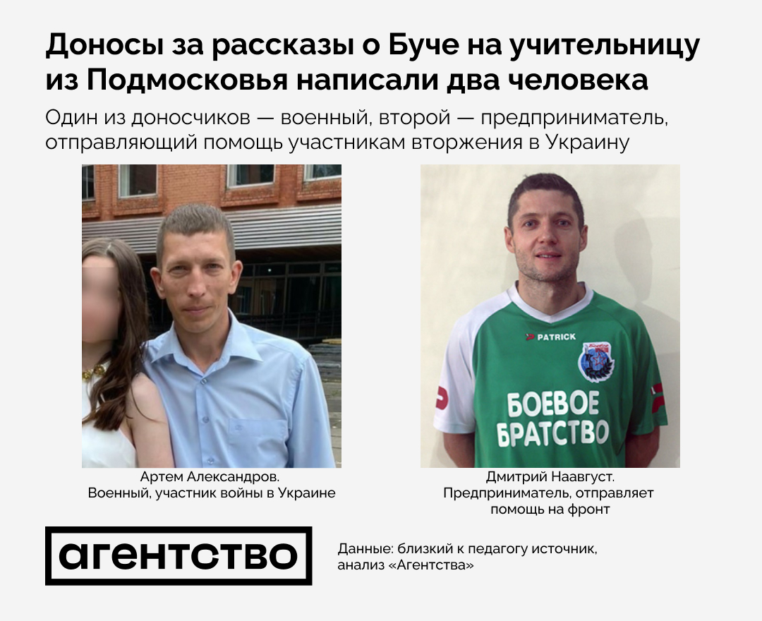 Детали. По словам собеседника «Агентства», на педагога жаловались Артем Александров и Дмитрий Наавгуст. В представлении прокуратуры города Серпухов, которое педагог получила в мае 2022 года после разговора с учениками о преступлениях российской армии в Буче, написано, что «по сообщению родителей учеников данного класса (8а) Наавгуста Г.Д. и Александрова А.М. подобные заявления учителя причинили психологические травмы и душевные страдания их детям».