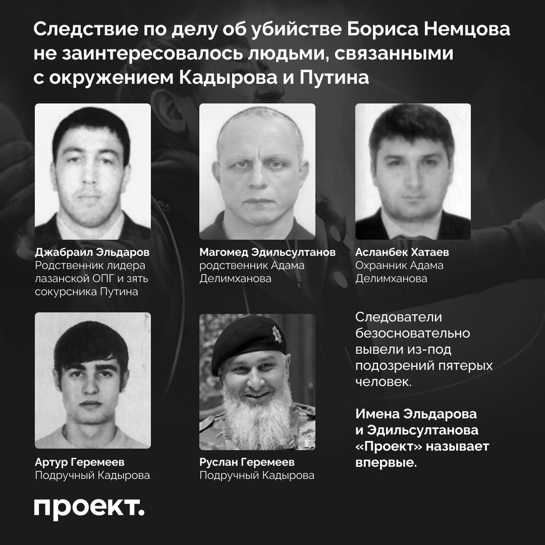 Исполнители убийства политика Бориса Немцова перед совершением преступления активно контактировали с Джабраилом Эльдаровым, Асламбеком Хатаевым и Магомедом Эдильсултановым. Ни одним из них следователи не заинтересовались, сообщает «Проект» в своем расследовании о Рамзане Кадырове.