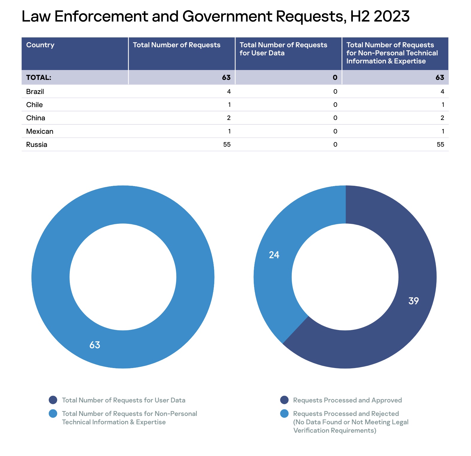 «Лаборатория Касперского» получила 55 запросов от российских правоохранительных органов во второй половине 2023 г. Это следует из отчёта о прозрачности компании. Ещё 4 запроса было из Бразилии, 2 — из Китая, по 1 — из Чили и Мексики. Все запросы касались технической информации и не имели отношения к персональным данным пользователей.
