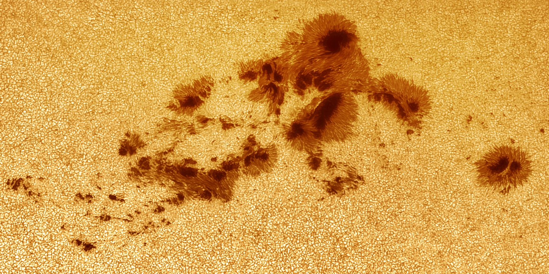 Что касается нашей группы пятен, то вы совершенно правы — она была рекордной, причем не только по времени жизни, но и по площади. Есть условные единицы — миллионные доли полусферы. Так вот, площадь нашей группы достигала 2400 условных единиц. Чтобы понимать, о чем идет речь: обычно площадь одной крупной группы пятен 200–300 условных единиц и меньше, самые большие группы пятен за предыдущие пять лет — около 1000–1200 единиц, но это всего три-четыре штуки за весь текущий цикл. Количество таких больших групп пятен очень невелико.