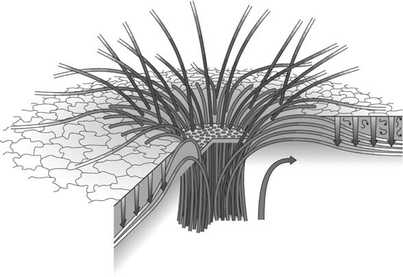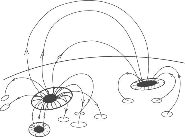 Вспомним замкнутые магнитные линии из учебника физики. А теперь представим себе, что некие процессы привели к тому, что образовался жгут магнитного поля, который обладает магнитной плавучестью в конвективной зоне Солнца. Если этот «жгут» образовался в недрах Солнца, то чем сильнее в нем магнитное поле, тем мощнее силы, которые выталкивают его на поверхность. И вот он всплывает, и срез этого «жгута» магнитного поля мы видим как солнечное пятно (рис. 2). Как правило, получается, что всплывает арка магнитного поля, и простейшие группы включают два пятна: головное и хвостовое — основания этой арки (рис. 3). Но магнитное поле подавляет конвекцию. Это значит, что поток вещества, всплывающий снизу, здесь замедляется, и в результате получается, что внутри этих пятен температура становится меньше, чем вокруг. На поверхности Солнца, в фотосфере температура примерно 5800–6000 °C, но там, внутри пятна, на тысячу — полторы тысячи градусов меньше. По контрасту эти области выглядят более темными по сравнению с солнечной поверхностью. Они, конечно, не темные, они светят очень ярко, но окружающий фон светит еще ярче, поэтому они выглядят темнее. Это мы и видим. Ну и понятно, что этот магнитный «жгут» существует не вечно: он постепенно выдувается больше, становится выше, и от него могут «отплетаться», отматываться магнитные трубки, из которых он состоит. Постепенно магнитная энергия, которая в этом «жгуте» содержится, релаксирует, расплывается, и пятно через какое-то время исчезает. Вернее сказать, не пятно, а группа пятен — очень редко бывает, чтобы пятно было одно в группе. Я не знаю, насколько то, о чем я рассказал, понятно, но я старался говорить на самом простом языке.