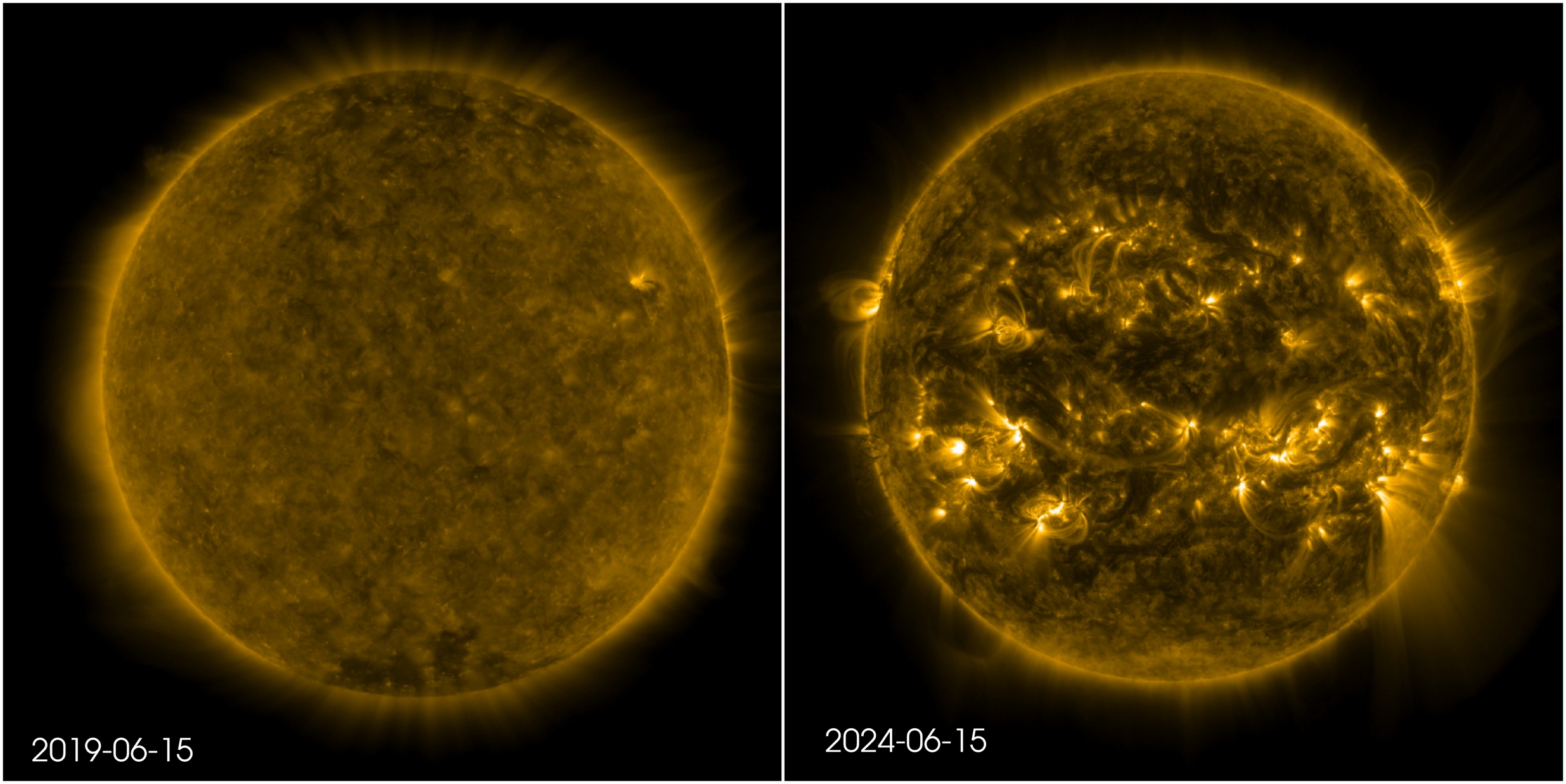 Фаза максимума бывает разной. Возьмем, например, самый мощный из известных нам солнечных циклов (они условно нумеруются с 1755 года) — так называемый 19-й цикл. Его максимум был в 1957 году. Он был одновершинный, т. е. солнечная активность шла вверх и потом сразу вниз. А 24-й цикл, предыдущий по отношению к нынешнему, был двухвершинным: в 2012 году был максимум, потом число пятен вроде пошло на спад, и вдруг совершенно неожиданно солнечная активность снова начала нарастать, и в 2014 году наблюдался второй максимум, который оказался выше первого. Получается, что вся фаза такого двухвершинного максимума продолжалась около двух лет.