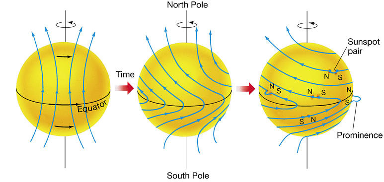 — Вопрос очень непростой. Опять-таки, если в нулевом приближении говорить, я боюсь, что в ближайшее время это сделать невозможно. Лишь, что называется, самыми крупными мазками. На сегодняшний день действительно существует стандартная модель, и мы в целом неплохо представляем себе, почему реализуется феномен солнечной активности. Это так называемая модернизированная модель Бэбкоков (Babcock model), названная в честь двух американских астрономов, отца и сына. Они выдвинули теорию так называемого солнечного динамо. В недрах Солнца работают два фактора. Во-первых, дифференциальное вращение Солнца. На экваторе оно вращается быстрее, чем на полюсах. Если мы, допустим, прорисуем меридиан или проложим магнитную силовую линию по меридиану, то она будет изгибаться, трансформироваться, на экваторе будет уходить вправо, если смотреть с Земли, а полярные области будут отставать (рис. 4). Во-вторых, там работает конвекция: то есть всплывает горячее вещество, остывает, теряет температуру за счет излучения, опускается. Там возникают конвективные ячейки. В-третьих, внутри Солнца — электропроводящая среда: температура высокая, атомы превратились в ионы (электроны отдельно, ионы отдельно, т. е. это плазма). И там движение заряженных частиц (ток) порождает магнитное поле. Взаимодействие магнитных полей с дифференциальным вращением как раз приводит к 11-летней цикличности Солнечной активности, по сути, магнитной активности. Если бы Солнце вращалось с другими скоростями или было бы других размеров, то цикл был бы не 11-летний. Грубо мы понимаем, что происходит внутри Солнца, и сейчас теория построена с учетом очень многих параметров, и всё больше и больше факторов учитывается при расчетах таких моделей.
