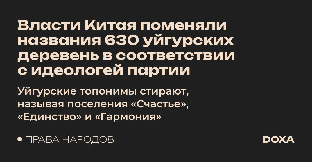 Human Rights Watch и норвежская организация Uyghur Hjelp«Уйгурская помощь» проанализировали названия деревень в Синьцзяне с сайта Национального бюро статистики Китая в период с 2009 по 2023 год. Исследование выявило около 630 деревень, названия которых были изменены. Три самых распространенных названия взамен прежних — «Счастье», «Единство» и «Гармония».