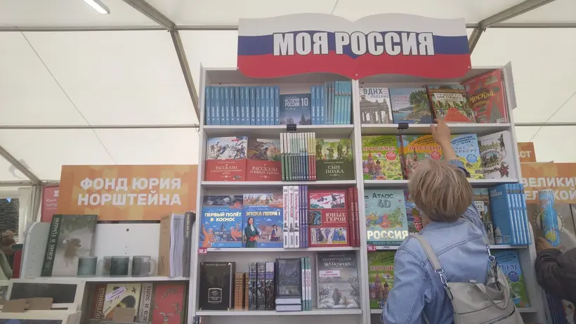 В шатре «История Отечества», тем временем, обсуждают неонацизм в Украине и «грехопадение украинских учебников». Спикер утверждает, что со второй половины 1990-х годов авторы последних искажают историю страны и ее отношения с Россией. В другом шатре обсуждают Гоголя, лекторка демонстрирует слушателям слайд «Гоголь и Малороссия». На стенде лежит фотоальбом «Хроника событий и судьбы ДНР», на одной из фотографий люди держат российский флаг с подписью «Донбасс с Россией». Девушка за прилавком предлагает корреспонденту «Реплики» взять календарик с акварельным рисунком с видом на набережную в Донецке. По словам девушки, библиотека, в которой она работает, приезжает на этот фестиваль уже второй год.