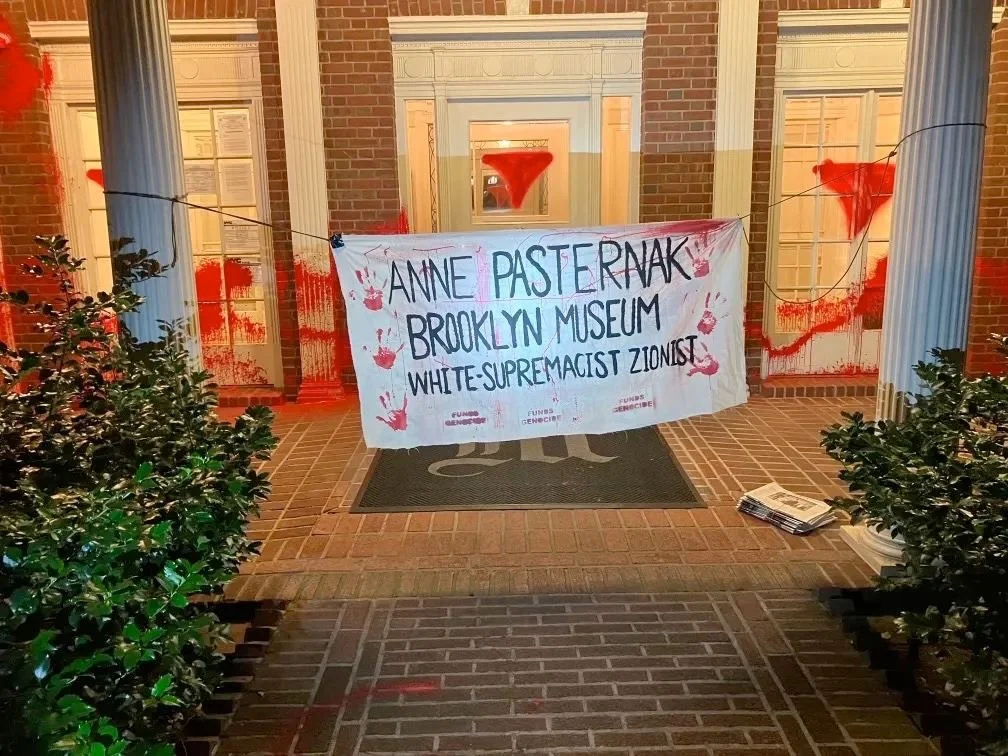 Над подъездом висел транспарант с отпечатками окровавленных ладоней и большой красной надписью «Энн Пастернак. Бруклинский музей. Белая расистка сионистка».
