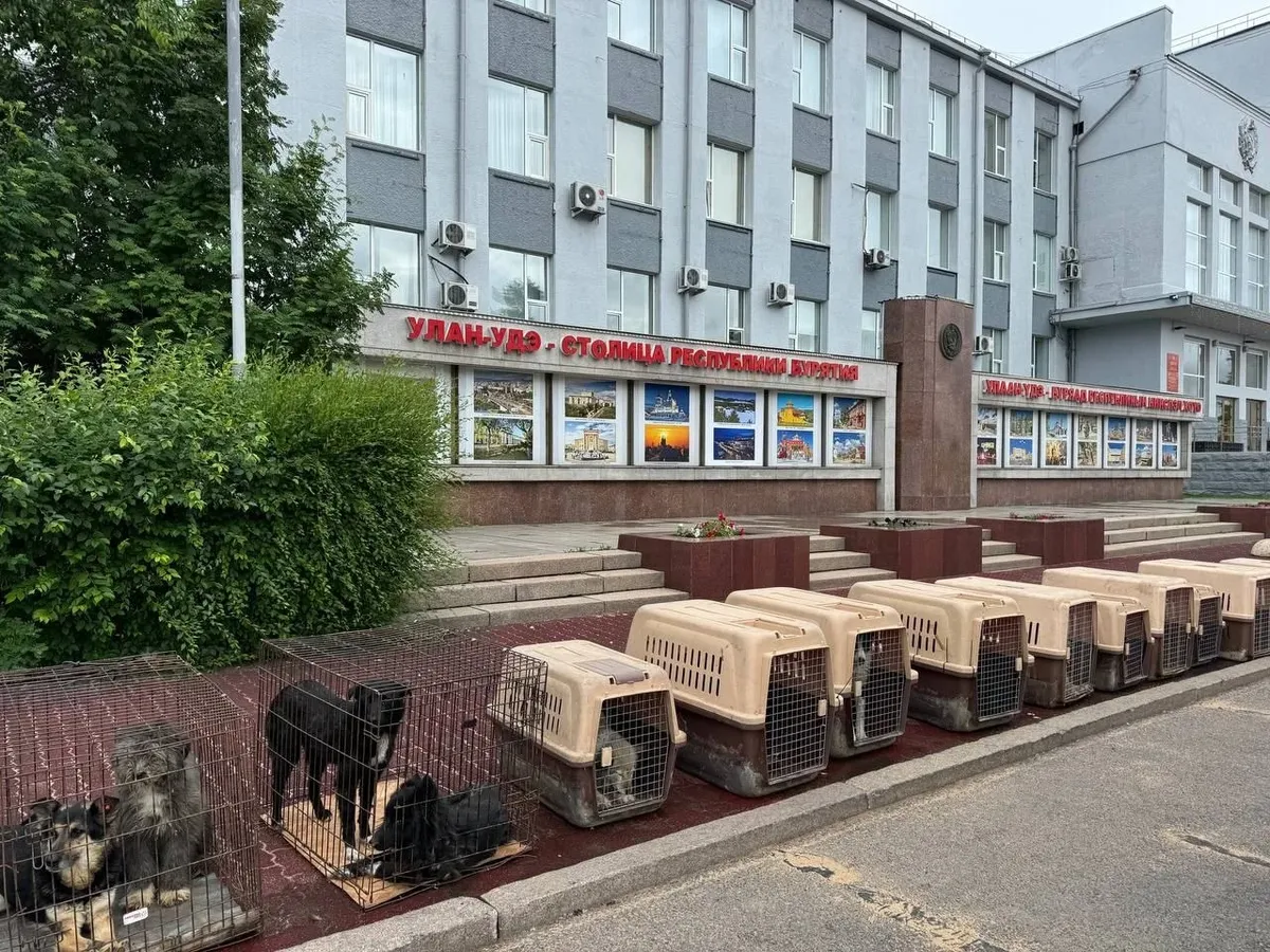 К зданию правительства Бурятии выставили 30 клеток с дворнягами. Отловили для эвтаназии, но закон приостановили — и собак «нечем кормить»