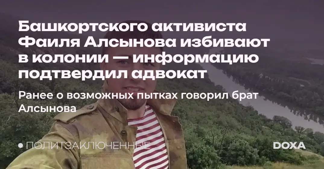 Башкортского активиста и политзаключенного Фаиля Алсынова пытают в колонии ИК-29 в Перми, подтвердил информацию адвокат осужденного Ильнур Суюндуков. Ранее брат Алсынова Идель заявлял о возможном применении насилия по отношению к активисту.