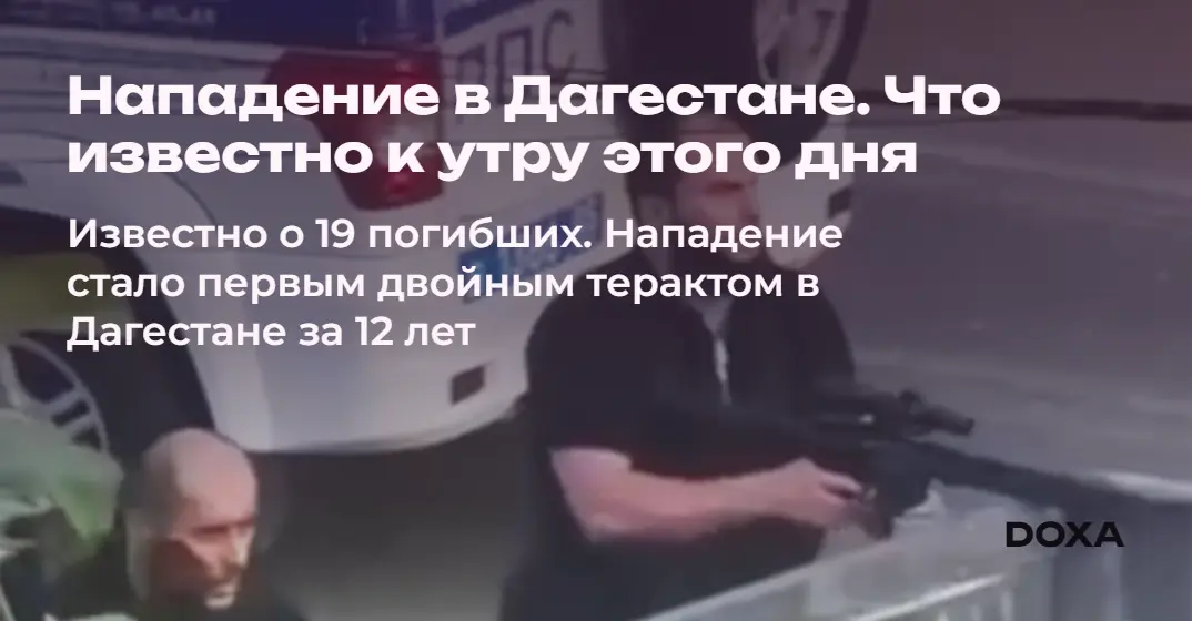 Вечером 23 июня в Дербенте и Махачкале неизвестные совершили нападение. В Дербенте атаке подверглась церковь Покрова Пресвятой Богородицы, в Махачкале — синагога. По данным связанных с силовиками телеграм-каналов Baza и 112, количество убитых достигло 20. Пострадали 44 человека.