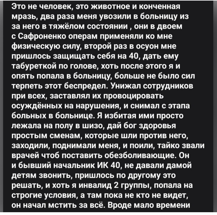 "Никто не должен подвергаться пыткам и жесткому обращению. Это нарушает ст. 12 УИК РФ – право осужденных на безопасность, жизнь и здоровье. В связи с наличием признаков совершения должностных преступлений направлены жалобы в следственные органы и прокуратуру Российской Федерации", – цитирует жалобу на условиях анонимности один из адвокатов, знакомых с делом.