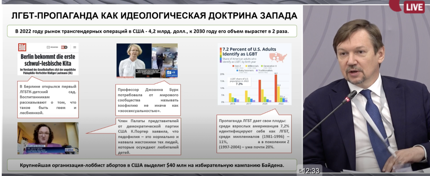 Детали. Журавский показал слайд «ЛГБТ-пропаганда как идеологическая доктрина Запада». На слайде перечислены шесть утверждений. Как минимум одно из них — о том, что член Палаты представителей от Демократической партии Кэти Портер заявила о нормальности педофилии — фейк. Он основан на вырванной из контекста цитате из выступления Портер в Конгрессе в 2022 году, писал проект «Проверено.Медиа». На самом деле конгрессвумен осуждала пользователей соцсетей, которые называют ЛГБТ-людей педофилами из-за их сексуальной ориентации.