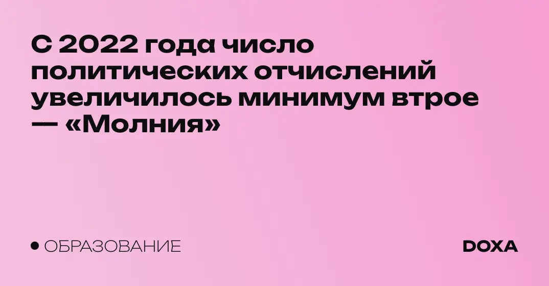 За 2022–2023В 2022 году отчислили 52, в 2023 году -- 31 годы университеты и колледжи отчислили минимум 83 студент:ки, в том числе шесть журналисто:к, подсчитал правозащитный проект «Молния». Это в три раза больше, чем совокупно за четыре года до полномасштабного вторжения России в Украину. Реальное число отчислений военного времени, вероятно, выше — правозащитни:цы могли оценить отчисления только из своей юридической практики и из опубликованных в СМИ кейсах.