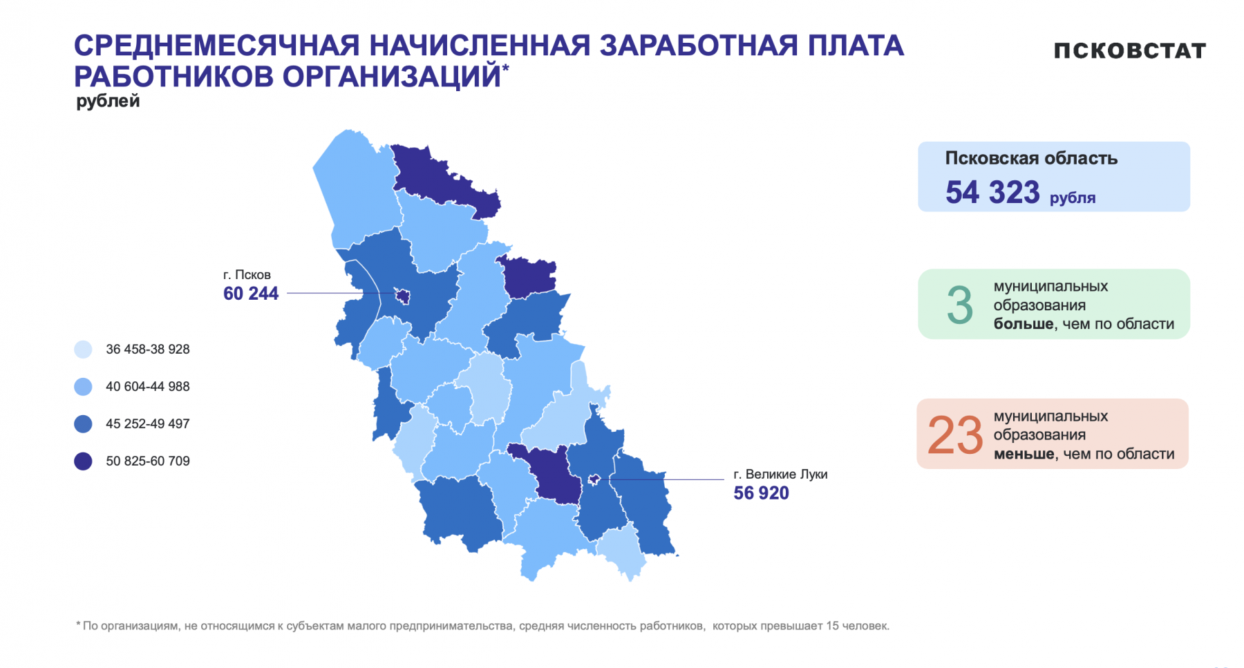 Среднемесячная зарплата работников организаций, не относящихся к субъектам малого предпринимательства, где средняя численность работников превышает 15 человек, составила 54 тысячи 323 рубля, причём, в 23 муниципальных образованиях эта зарплата меньше, чем по области, а в трёх — больше. В Пскове средняя зарплата работников организаций составила 60 тысяч 244 рубля, в Великих Луках — 56 тысяч 920 рублей.