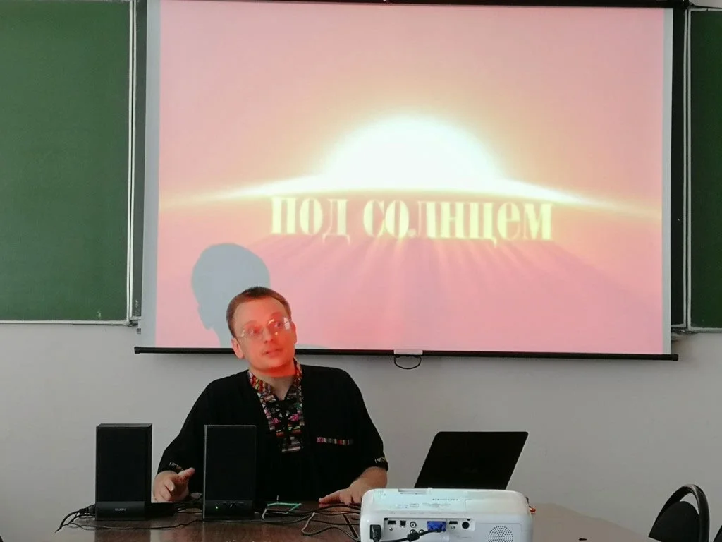 Лектор — худой, в темной рубашке и толстых очках — говорит об опасности трансгуманизма, заложенного в кинофильме «Чебурашка».