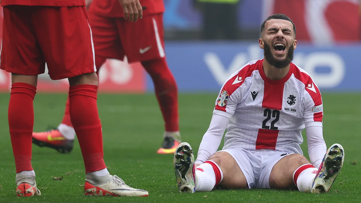 Джордж Микаутадзе (Грузия) во время футбольного матча группы F ЕВРО-2024 между сборными Турции и Грузии в Дортмунде, Германия, 18 июня 2024 года. Фото: Christopher Neundorf / EPA-EFE